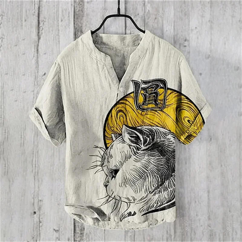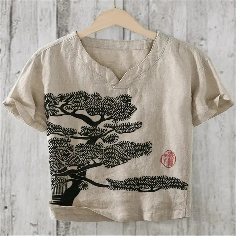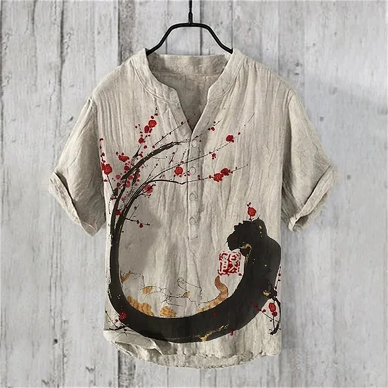 2024 Summer Men's V-neck Short Sleeve T-shirt Casual Print The Great Wave off Kanagawa Linen Blended Shirt